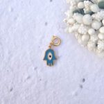 This piece is shaped as the ancient hamsa talisman, a palm-shaped symbol of good luck and fortune. Detailed with a eye in the middle, it’s cast from brass that’s been polished to a shine with 18k gold plating. The symbolic charm makes a thoughtful gift or meaningful addition to a charm bracelet.