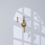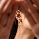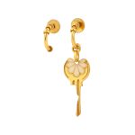 This assymetric pair consists of one minimal bali and one drop earring of our Key motif. The motif used has a fine silhouette of a face of a woman. The motifs used in this collection represent a jucstaposition of masculine structures and female sihouettes.