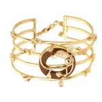 This statement cuff has been inspired by wilsons bird of paradise pinned on wood and accentuated with leafs surrounding the motif, glazed with gold plating. This piece has an adjustable chain at the back to fit your wrist perfectly.